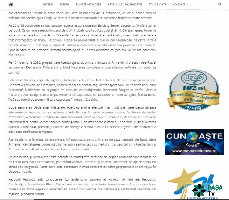 Rumıniyanın Peşəkar Jurnalistlər İttifaqının sədr müavini xanım Teodora Marinin 44 günlük Vətən müharibəsi zamanı Prezident İlham Əliyevin rəhbərliyi ilə Azərbaycan Ordusunun uğurları barədə analitik məqaləsi “Ultima Ora” (Son saat) qəzetinin çap və onlayn versiyalarında dərc edilib.PAŞATv xəbər verir ki, müəllif məqalədə Azərbaycan Prezidenti İlham Əliyevin rəhbərliyi ilə iqtisadi tərəqqiyə nail olunduğu və Cənubi Qafqaz regionunun ən qüdrətli dövlətinə çevrildiyini bildirib. T.Marin Vətən müharibəsinin xronologiyasına diqqət çəkərək qeyd edib ki, müharibə dövründə Ermənistan silahlı qüvvələri cəbhəboyu ərazilərdə yerləşən Ağdam, Ağcabədi, Beyləqan, Daşkəsən, Füzuli, Goranboy, Tərtəri intensiv şəkildə atəşə tutub. Ermənistan, həmçinin cəbhə bölgəsindən uzaqda yerləşən Gəncə, Bərdə, Mingəçevir, Qəbələ, Siyəzən, Xızı və digər şəhərləri də hədəf seçib. Raketlərdən biri Azərbaycanın hava hücumundan müdafiə sistemləri tərəfindən Bakının yaxınlığında yerləşən Xızı üzərində zərərsizləşdirilib. Paytaxt Bakı da Ermənistanın raket hücumlarının hədəfi idi. Ermənistan “Skad” və “İsgəndər-M” tipli ballistik raketlərdən, habelə qadağan olunmuş ağ fosforlu və kaset tipli sursatlardan istifadə edirdi. Ermənistanın bu müharibə cinayətləri nəticəsində 100-dən çox dinc sakin, o cümlədən 11 uşaq qətlə yetirilib, 450-dən çox insan yaralanıb.